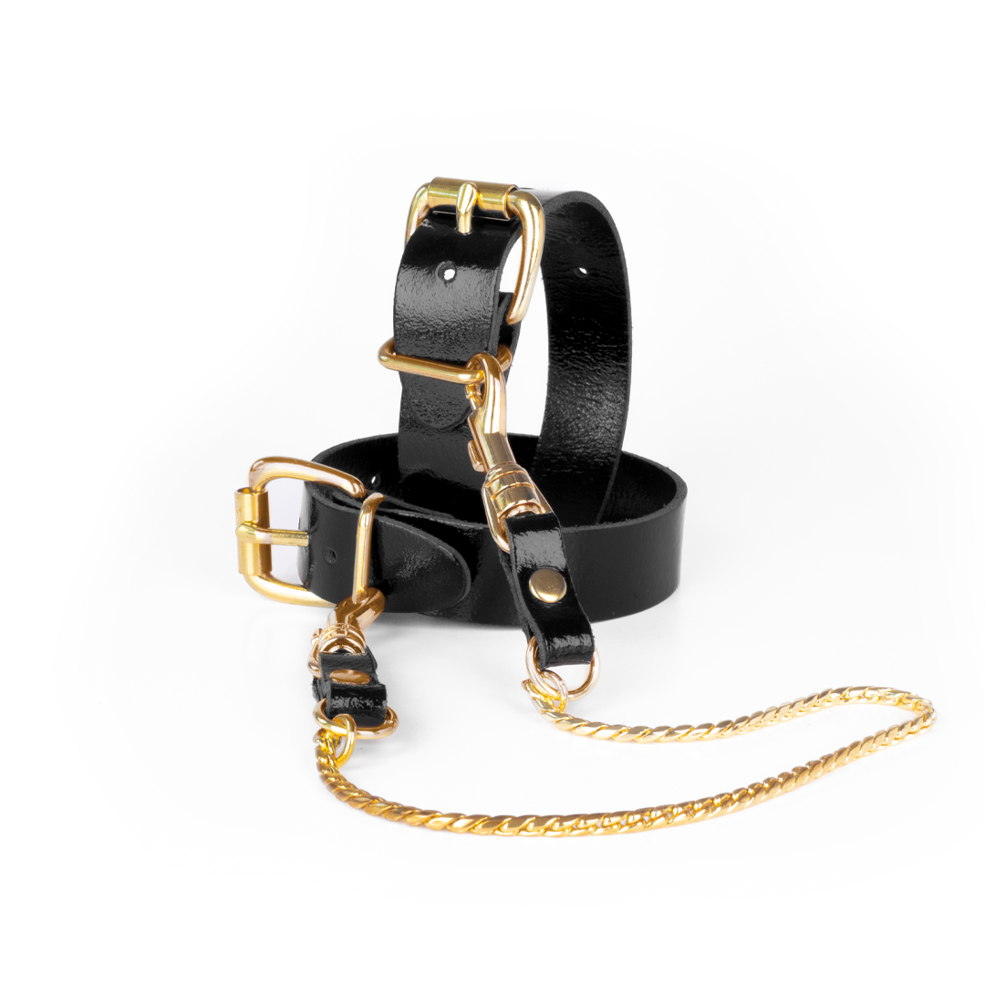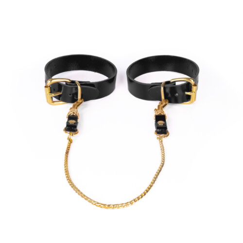 This exceptional set is perfect for both beginners and experienced bondage enthusiasts. The black leather feetcuffs and gold chain for fastening them together create a luxurious and timeless combination that will captivate you.