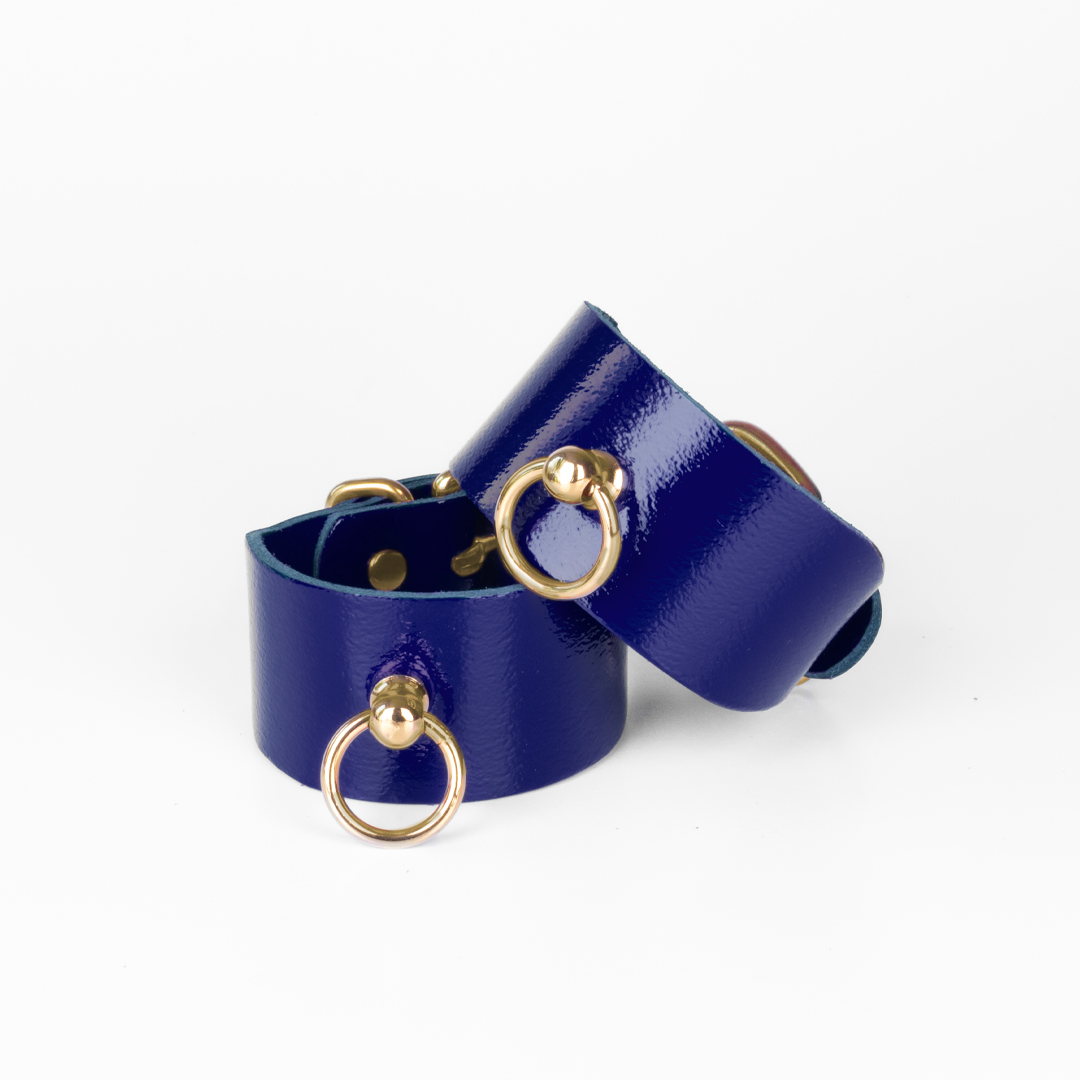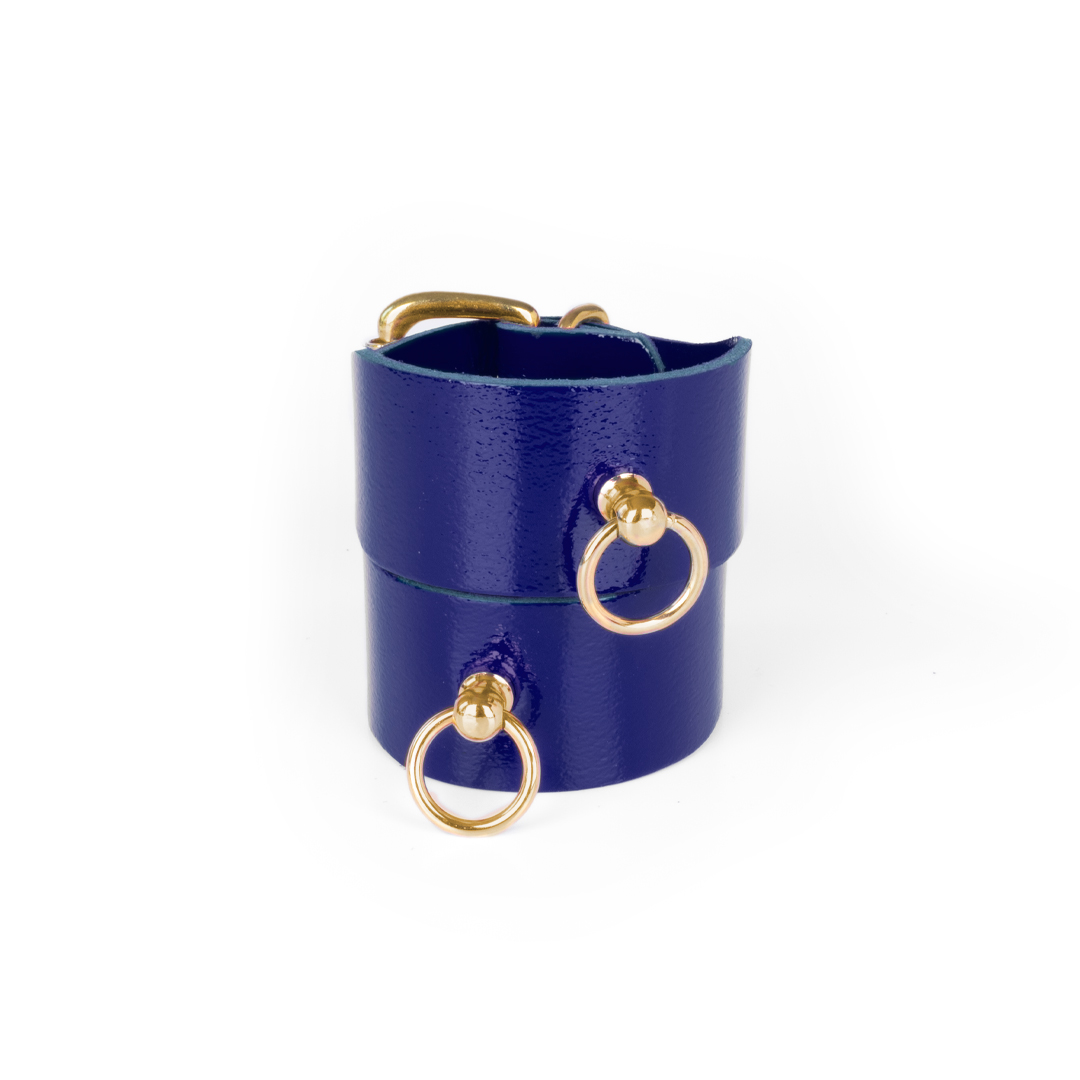 Are you looking for handcuffs that stand out from other accessories? This leather model in a deep indigo shade with elegant gold details might be perfect for you.